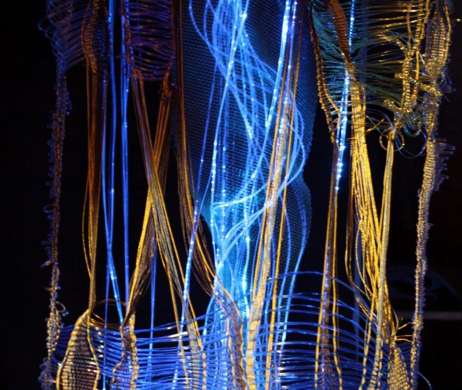 A experimental and collaborative textile installation using non-traditional materials. Fiber optics, metals, monofilament, plastics, beaded silk rags and rayon